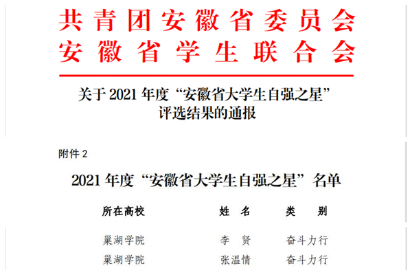 近日,由团省委、省学联组织开展的2021年度“安徽省大学生自强之星”评选活动结果公布。我校计算机与人工智能学院软件工程专业2020级学生李贤、外国语学院商务英语专业2019级学生张温情以“奋斗力行”类别,获评2021年度“安徽省大学生自强之星”称号。