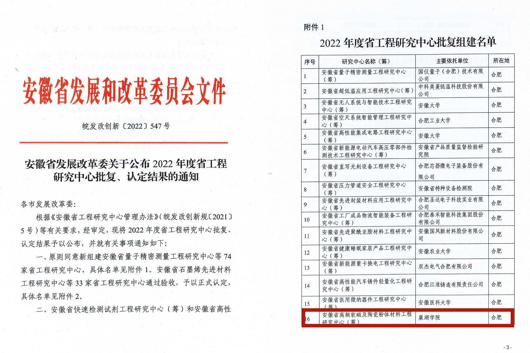 近日,安徽省发展和改革委员会发布《安徽省发展改革委关于公布2022年度省工程研究中心批复、认定结果的通知》,由365bet赌场手机投注_det365下载_365bet备用网学院化学与材料工程学院申报的“安徽省高频软磁及陶瓷粉体材料工程研究中心”成功获批。这是学校获批的第2个安徽省工程研究中心,标志着学校在省级科研创新平台建设方面再次取得突破。