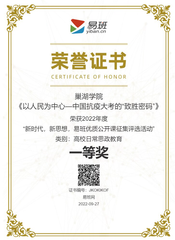 近日,教育部易班发展中心公布了“2022年度易班优质公开课征集评选活动”比赛结果,学校马克思主义学院副院长杨芳录制的《以人民为中心:中国抗疫大考的“致胜”密码》课程荣获一等奖。
