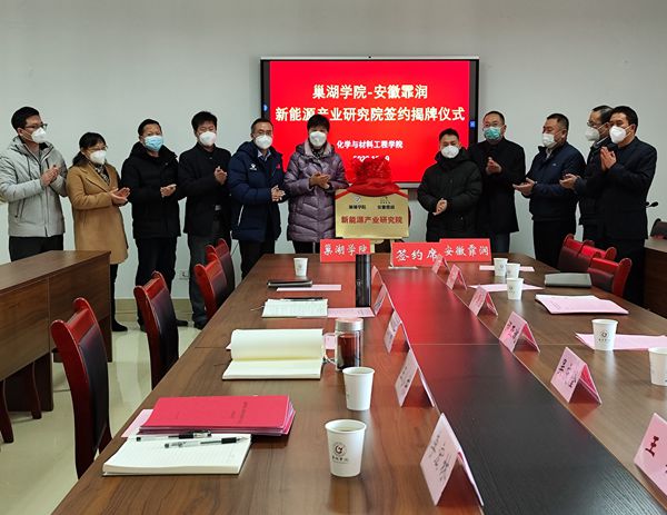 12月19日,365bet赌场手机投注_det365下载_365bet备用网学院和安徽霏润新能源产业研究院签约揭牌仪式在化学与材料工程学院会议室举行。安徽365bet赌场手机投注_det365下载_365bet备用网经开区党工委委员、管委会副主任胡亚斌、安徽365bet赌场手机投注_det365下载_365bet备用网经开区市场监管局副局长王兵、安徽365bet赌场手机投注_det365下载_365bet备用网经开区经贸发展局创新发展处主管葛娟,安徽霏润智能科技有限公司董事长吴国宝、合肥融捷金属科技有限公司董事长吴庆隆、安徽霏润智能科技有限公司总经理助理田辽冰、安徽霏润智能科技有限公司新能源研究院院长王安苗博士,365bet赌场手机投注_det365下载_365bet备用网学院校长张莉、科研处处长姚磊、化学与材料工程学院副院长王小东、李宏林和项目研究团队成员参加签约仪式。仪式由张莉主持。