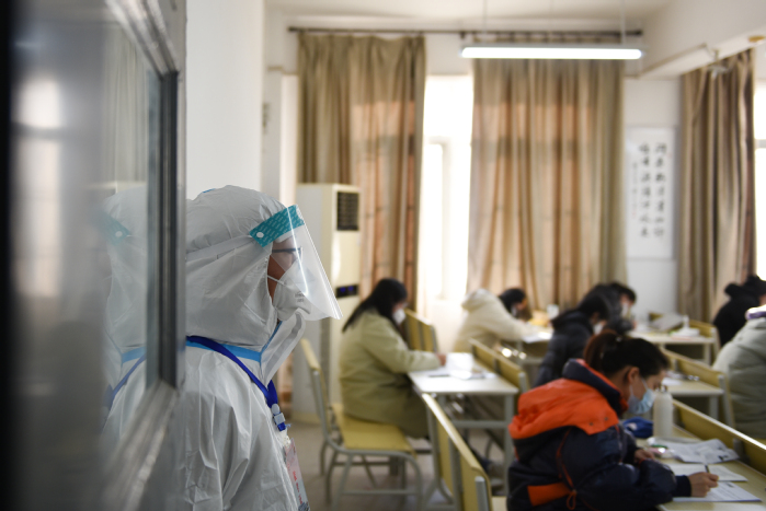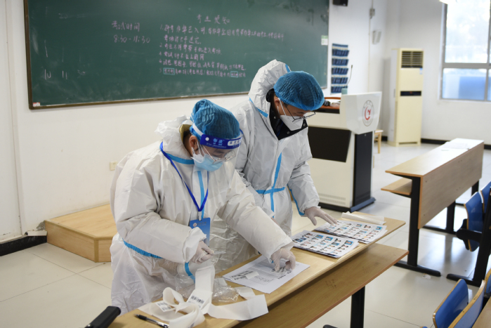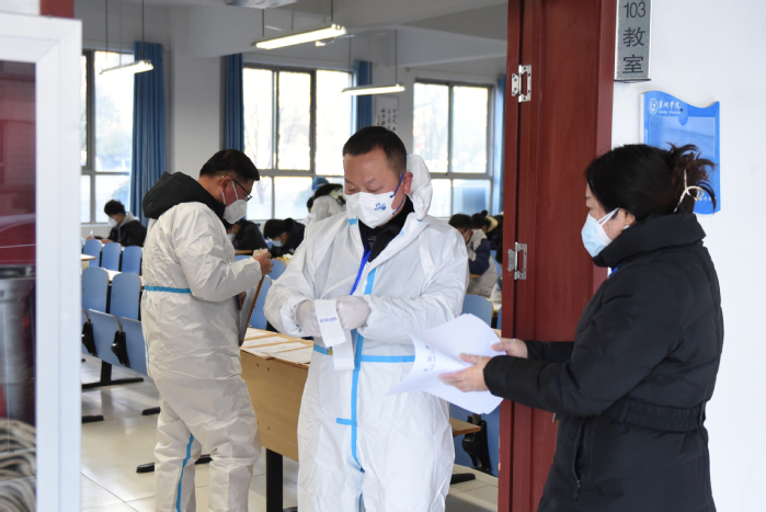 受疫情影响,考点设置了备用考场,党员干部和教师主动请缨担任监考,用实际行动践行了育人为师,战“疫”为士。