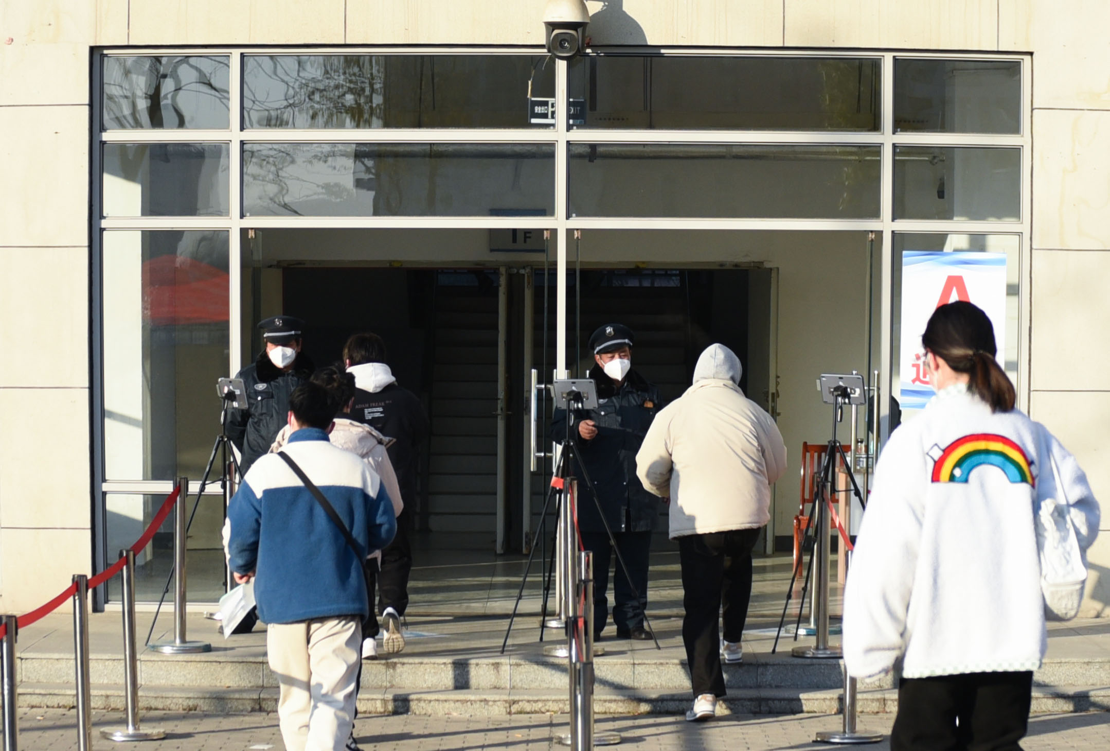 学校各考区入口设置测温通道,考生入场前接受体温检测。设置相应通道,考生进入考点进行人脸识别,以严格核验身份。在考生入场过程中,工作人员及时处理异常和突发情况,确保所有考生“应考尽考”。