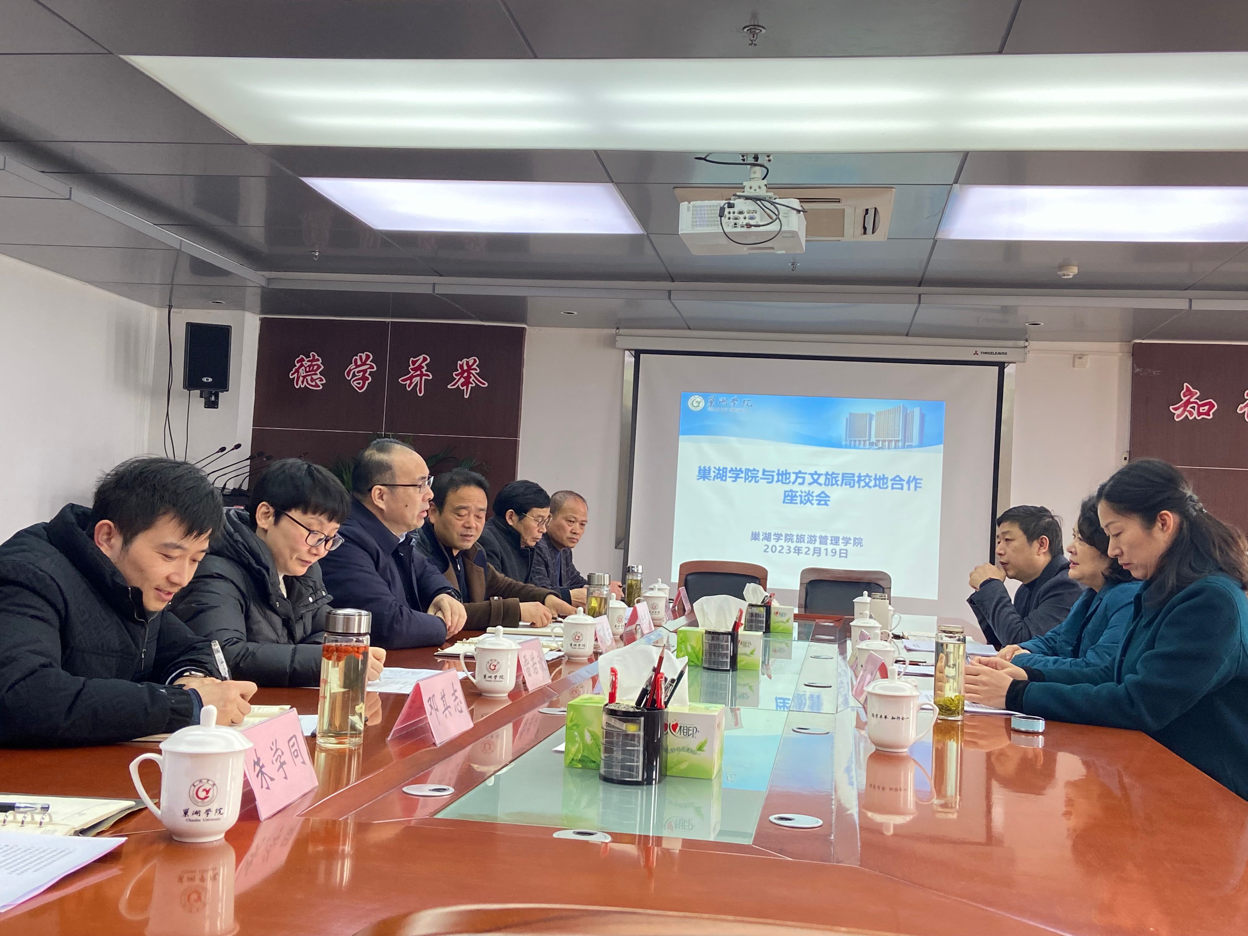 2月19日上午,合肥市文化和旅游局副局长俞晓华、庐江县文化和旅游局局长苏荣、365bet赌场手机投注_det365下载_365bet备用网市文化和旅游局局长曹丰一行莅临365bet赌场手机投注_det365下载_365bet备用网学院,就校地产学研合作与学院教师进行座谈。座谈会在学校第一会议室召开。副校长丁俊苗、旅游管理学院党委副书记洪作奎、副院长雷若欣、副书记邓其志、组织员董金山以及相关教师参加了座谈会。会议由旅游管理学院副院长雷若欣主持。