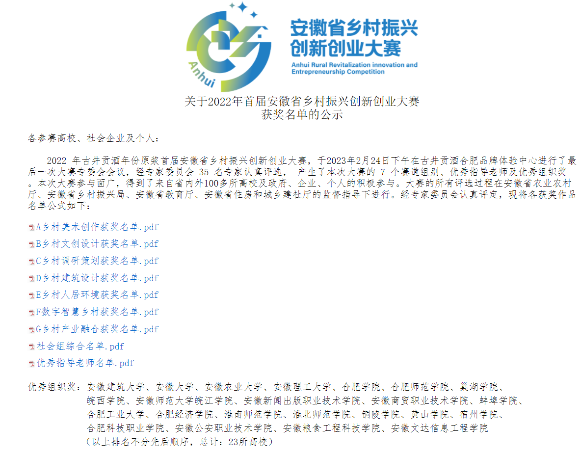 2022年,安徽省乡村振兴创新创业大赛已被认定为省级B类赛事。今后,该赛事将会受到更多高校的重视。为此,旅游管理学院将承办乡村调研策划和文创设计赛道作为学院2023年重点工作之一,希望通过为全校师生提供更多参与和实践的机会再创佳绩!(文、图/杨仲元 部门审核/雷若欣 终审/张连福)