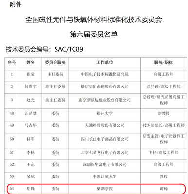 胡锋博士当选全国磁标委和磁技术专委会委员,有利于学校安省高频软磁及陶瓷粉体材料工程研究中心的建设和发展,有利于提高学校在国内该领域的知名度和影响力。(文/余梅 图/胡锋 部门审核/王小东 终审/张连福)