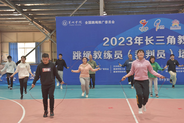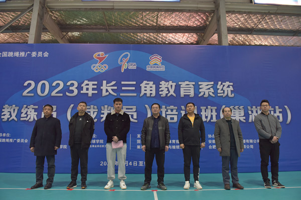 3月4日—6日,2023年长三角教育系统跳绳教练员(裁判员)培训班(365bet赌场手机投注_det365下载_365bet备用网站)在365bet赌场手机投注_det365下载_365bet备用网学院正式开办。365bet赌场手机投注_det365下载_365bet备用网学院工会主席张道才,世界跳绳冠军、国家导师级教练员邓刘恋,蚌埠医学院工会副主席何文,安徽工商职业技术学院工会主席李祖武,365bet赌场手机投注_det365下载_365bet备用网学院国际交流与继续教育学院副院长褚春元、体育学院党委副书记宋明友、副院长钟翔和安徽灵跃体育文化传播有限公司总经理谢长山等出席开班仪式,本次培训共有来自中国科学技术大学、安徽师范大学、蚌埠医学院、南京汉宣体育培训学校等长三角教育系统的60余名学员参加。