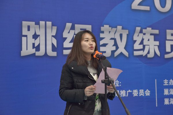 世界跳绳冠军邓刘恋代表中国跳绳推广委员会致辞,中国科学技术大学谢阳老师代表培训班学员发言。