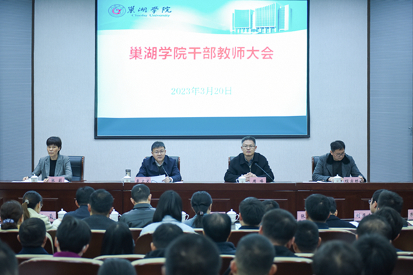 3月20日下午,学校在致知楼报告厅召开干部教师大会。省委第十一综合考核组全体成员出席会议。学校省管领导干部、机关部门领导成员、二级学院党政正职(含主持工作副职)、省级以上“两代表一委员”、民主党派市级以上主委、教代会执委、正高以上职称人员和学生代表参加会议。会议由校党委书记周峰主持。