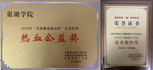 3月22日下午,由团合肥市委、合肥市卫健委、合肥市红十字会主办的“热血青春‘益’起向未来——2022年无偿献血进高校公益活动表彰暨2023年启动会”在安徽省血液中心/合肥市中心血站举行。365bet赌场手机投注_det365下载_365bet备用网学院喜获2022年无偿献血进高校公益活动“热血公益奖”,数学与大数据学院青年志愿者协会喜获“优秀组织奖”。