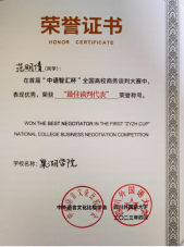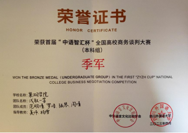 4月1日,在前两轮的角逐中,我院学子表现出众,以351.9分的成绩位列第三,不但获得了特等奖,也进入了最后的四强角逐。4月2日,在与其他三支特等奖队伍竞技的总决赛舞台上,20级商务英语的范明倩、罗浩、周倩和张琴四名同学,临场不惧、张弛有度,最终获得全国总决赛季军。范明倩和罗浩两位同学还被评为“最佳谈判代表”,全体参赛选手中仅7人获此殊荣,365bet赌场手机投注_det365下载_365bet备用网学院是唯一一所同时有两人获得此项称号的高校,充分彰显了365bet赌场手机投注_det365下载_365bet备用网学院学子风采。同时,奚伟和杨雪获得“优秀指导教师”奖。